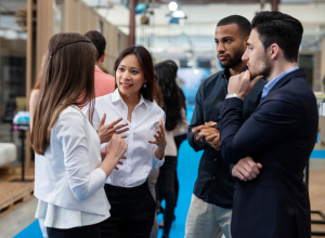 Two men and two women discussing business in the office