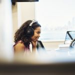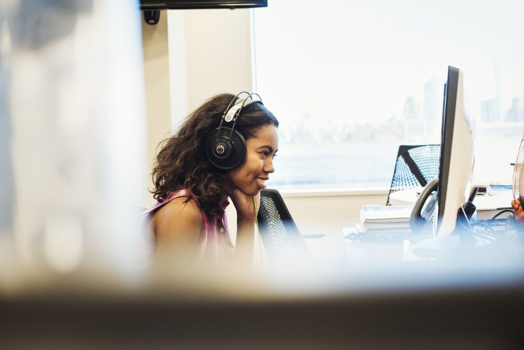 A woman sitting at a computer at an office wearing headphones.,New York Business