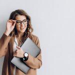 Beautiful business woman in a glasses with smile and a laptop in her hands in the office near a white wall with blank space for text