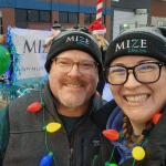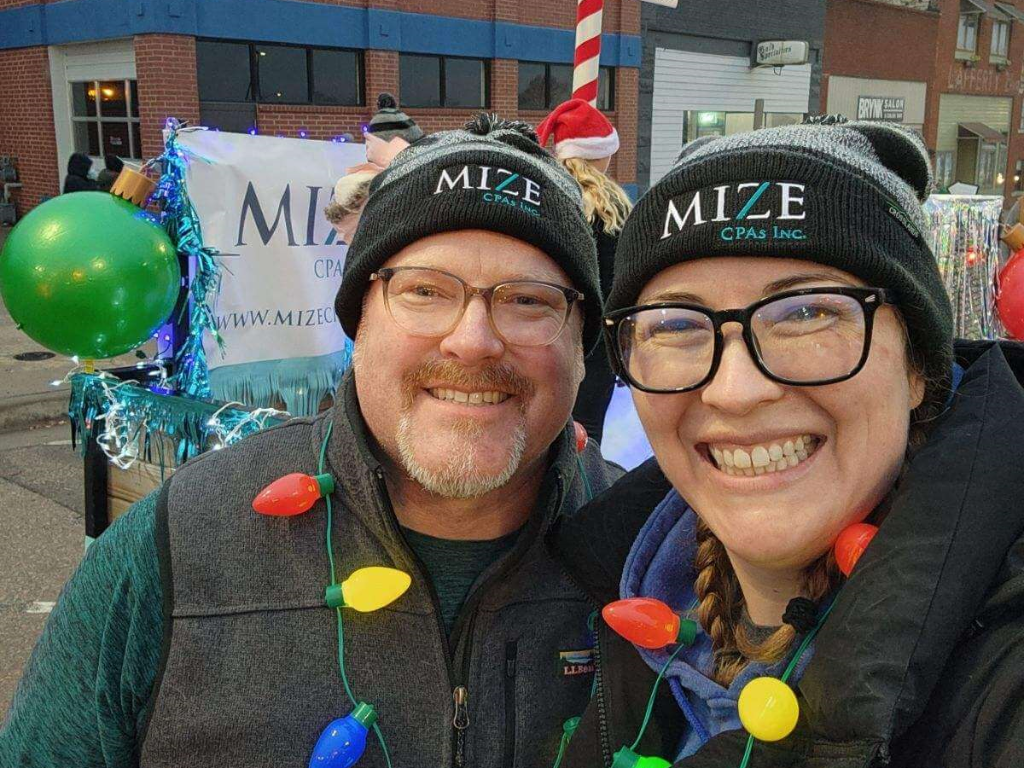 Two Mize Employees wearing Mize Stocking Caps and a Necklace of Holiday Lights Smiling in front of the North Pole Float