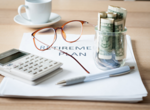 calculator, glasses, pen, and jar of cash sitting on top of a paper labelled RETIREMENT PLAN
