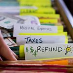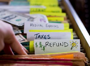 Close up on file cabinet drawer with hand thumbing through files. Refund, Taxes and Medical Expenses are the names on the files