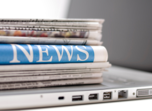 stack of newspapers on top of a closed laptop