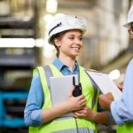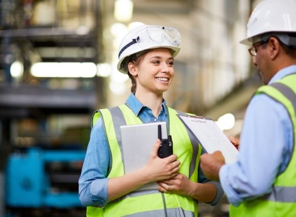 Young female construction worker talks to an older male worker