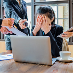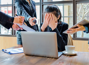 A stressed woman sitting at her computer with her face in her hands while two other people hand her more things to work on