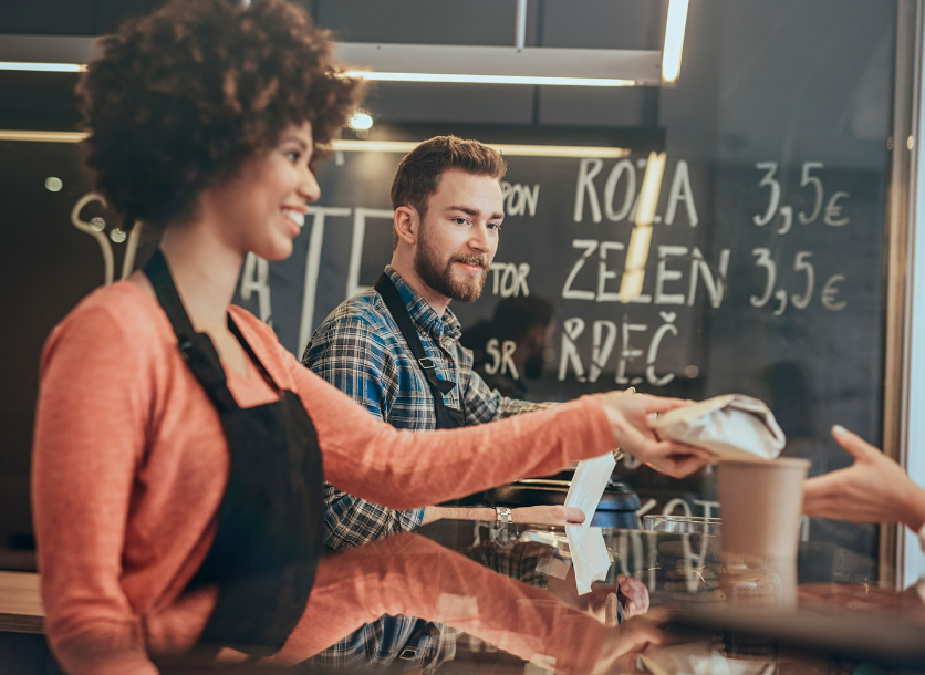 Fast food worker serving a customer
