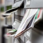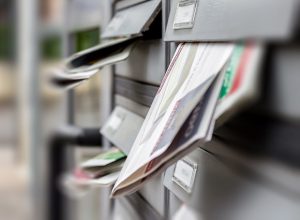 Mailbox full of junk of adverstising brochures outside apartment block. Defocused blurry background.