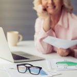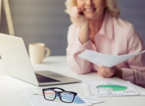 Beautiful old woman in classic shirt is holding papers, looking at camera and smiling while working with a laptop at home