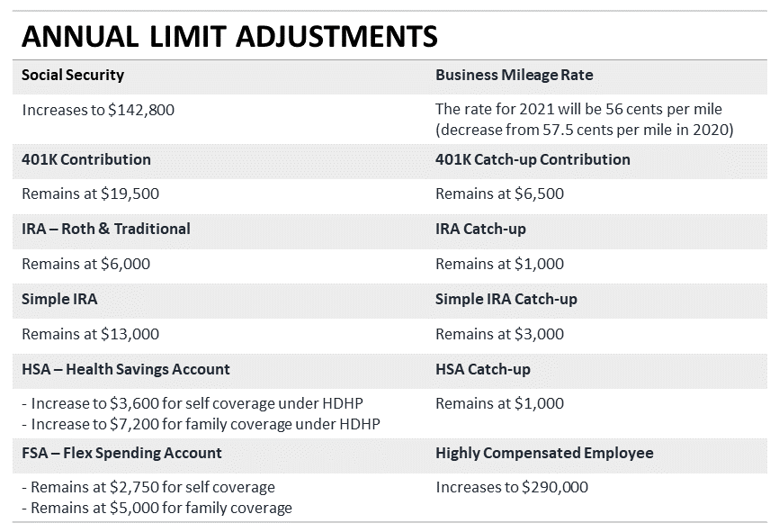 Plan Ahead for Annual Limit Adjustments for HSAs, 401(k) Plans, Business Mileage and Other Benefits