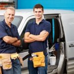 Father and son wearing toolbelts in front of work van