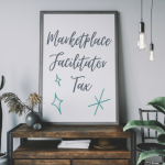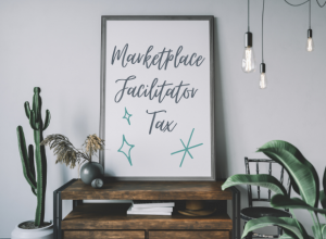 Dry erase board on a wooden table surrounded by house plants. Lightbulbs hang from the celling. On the board it reads “Marketplace Facilitator Tax”
