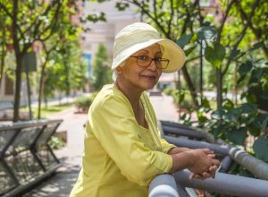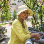 Retirement age woman in bright yellow top and sun bonnet looking at the camera and smiling on a sunny day